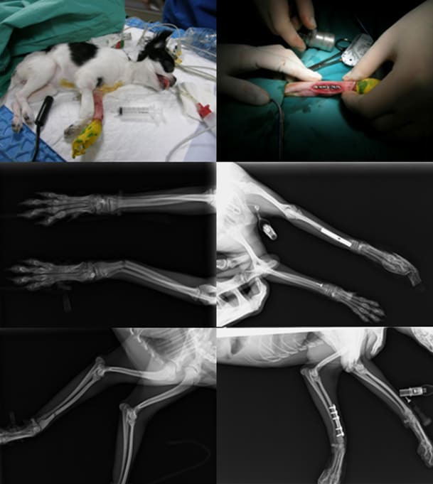 紅貴賓因為車禍導致小腿脛骨骨折,這個部位骨折採用骨外固定(External Skeletal Fixation, ESF)的方式是首選,主要是因為脛骨軟組織包覆少,骨板加螺釘勢必切開皮膚等軟組織,破壞骨膜外循環。使用ESF的方法,僅需小範圍切開,避免傷害軟組織(如肌肉、韌帶等),達到微創的目的,也得到較快的骨折癒合。